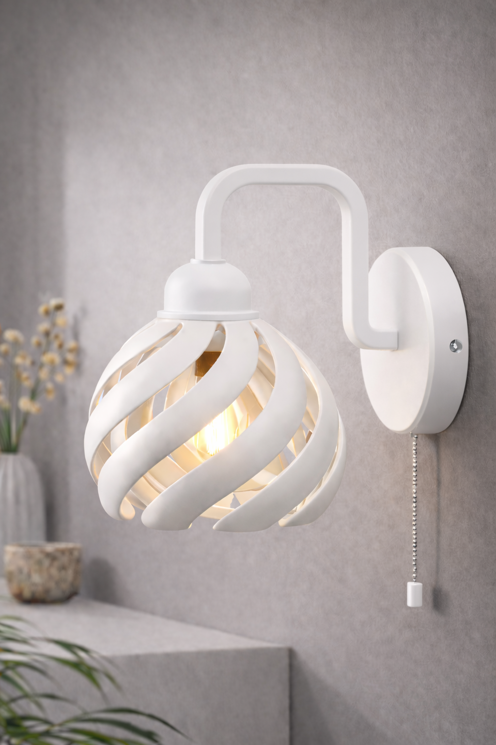 Zincir anahtarlı duvar aplik modeli, spiral formdaki özel tasarımıyla modern ve bohem dekorasyon tarzını bir araya getirir. Başucu, salon ve okuma alanlarında şık ve fonksiyonel bir aydınlatma sunar.